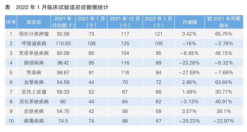 從1月份新增臨床試驗的熱門適應(yīng)癥情況來看,組織分類腫瘤仍為最熱門研發(fā)領(lǐng)域,試驗數(shù)量為121項,相較于2021年12月份上升3.42%。1月份主要熱門適應(yīng)癥的臨床試驗相較于2021年12月份大多呈現(xiàn)上升趨勢,下降明顯的熱門適應(yīng)癥為病毒類疾病。推測新冠肺炎疫情對于臨床試驗的影響正在顯著下降,臨床試驗正在逐步恢復常態(tài)。