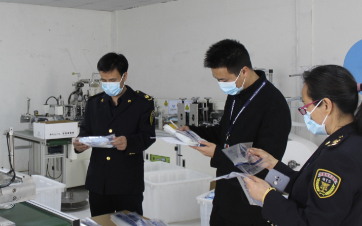 圖為執(zhí)法人員在一家醫(yī)用口罩生產(chǎn)企業(yè)檢查。