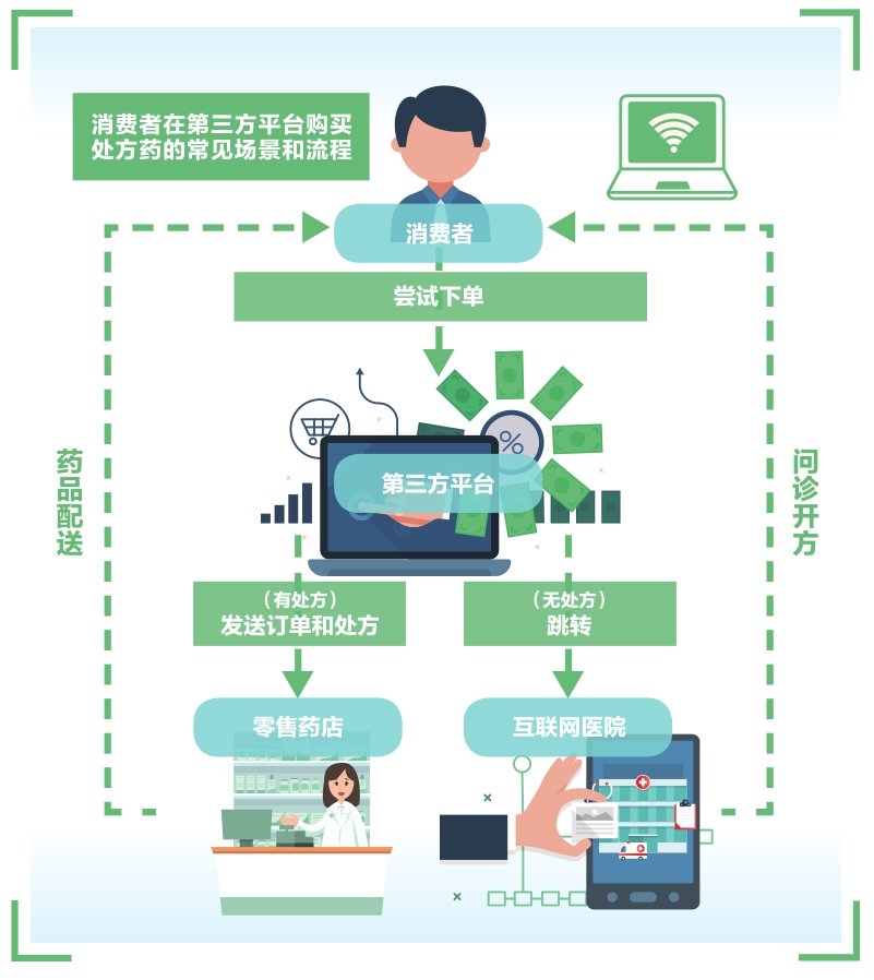通常而言,消費(fèi)者在第三方平臺購買處方藥的場景和流程如下圖。