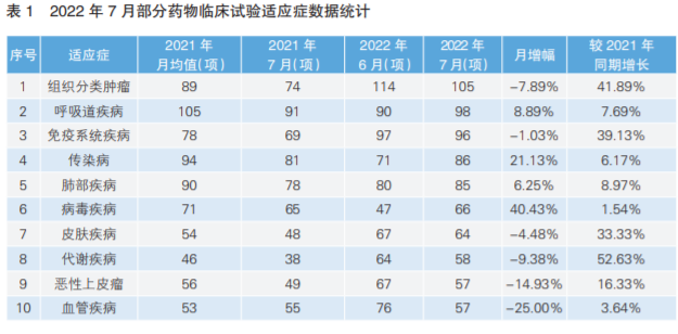 從適應(yīng)癥來看,組織分類腫瘤治療仍為7月份所有新開臨床試驗(yàn)中最主要的熱門研發(fā)領(lǐng)域,新開相關(guān)臨床試驗(yàn)數(shù)量105項(xiàng),較6月份降低7.89%。各適應(yīng)癥領(lǐng)域新開臨床試驗(yàn)數(shù)量相較上月大多呈下降趨勢,其中降幅最大的為血管疾病領(lǐng)域,降幅為25.00%。數(shù)量增長較為明顯的熱門適應(yīng)癥為病毒疾病和傳染病,同比增幅分別為40.43%和21.13%,呼吸道疾病和肺部疾病領(lǐng)域也略有增加(詳見表1)。
