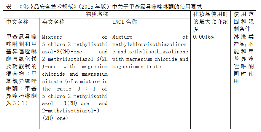 甲基氯異噻唑啉酮的化學物質登錄號(CAS)為26172-55-4,分子式為C4H4ClNOS,分子量為149.6,因毒性較大,不允許單獨用于化妝品。根據《化妝品安全技術規(guī)范》(2015年版),需和甲基異噻唑啉酮與氯化鎂及硝酸鎂以"混合物"的形式使用,僅可用于淋洗類產品使用該防腐劑,且不能和甲基異噻唑啉酮同時使用(詳見表)。