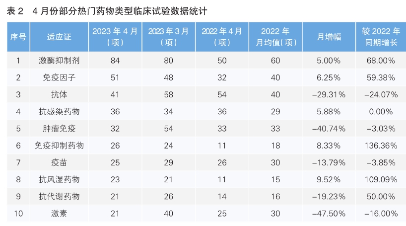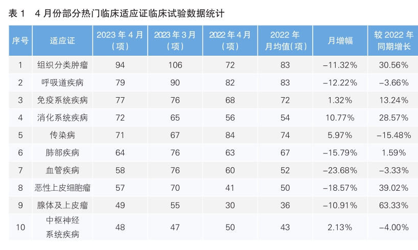 從4月份新增臨床試驗熱門適應(yīng)證領(lǐng)域來看,組織分類腫瘤仍為最主要的熱門研發(fā)領(lǐng)域,試驗數(shù)量為94項,相較3月份下降11.32%;其次為呼吸道疾病領(lǐng)域,數(shù)量相較于上月下降12.22%。月降幅最高的熱門適應(yīng)證為血管疾病,單月降幅為23.68%。相較于上月,4月份熱門領(lǐng)域臨床試驗數(shù)量增長最快的為消化系統(tǒng)疾病領(lǐng)域,月增幅為10.77%;其次為傳染病領(lǐng)域,月增幅為5.97%。相較于去年同期,同比增幅最為顯著的為腺體及上皮瘤,為63.33%;同比降幅最高的為15.48%,為傳染病領(lǐng)域。