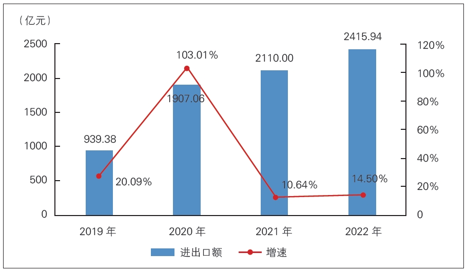 圖 2019—2022 年我國與“一帶一路”沿線國家醫(yī)療器械進出口額及增速情況