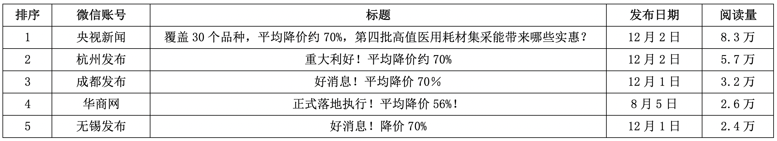 這一時期,媒體紛紛集中關(guān)注擬中選結(jié)果。如《人民日報》刊發(fā)《平均降價70%左右!第四批國家組織高值醫(yī)用耗材集采產(chǎn)生擬中選結(jié)果》稱,本次集采主要惠及需晶體植入的白內(nèi)障患者以及需進行運動醫(yī)學(xué)手術(shù)的因運動而肌肉韌帶損傷的患者。美國愛爾康公司今年新上市的景深延長晶體降至3500余元/個,高性能的三焦點晶體(非散光)降至8900余元/個;美國強生公司的新一代單焦點晶體降至1100余元/個;英國施樂輝公司的人工骨下降到300余元/cm3。除此以外,新華社發(fā)表《30個品種平均降價約70%——第四批國家組織高值醫(yī)用耗材集采看點》、每日經(jīng)濟新聞發(fā)表《直擊第四批高值耗材國采現(xiàn)場:全場最低報價于唱標(biāo)后第15分鐘誕生,中選產(chǎn)品平均降幅約70%》等。