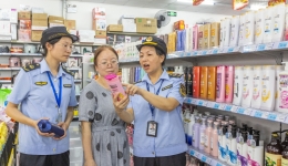 圖為該局執(zhí)法人員在轄區(qū)一家超市化妝品專柜抽查洗發(fā)水情況。(黃勝林 攝)