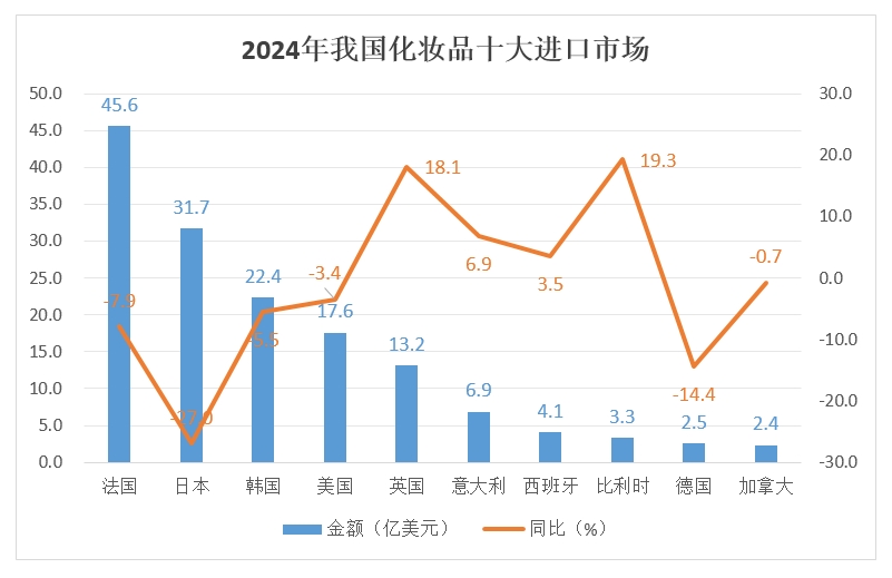 美國和英國自2020年以來一直分列我國第四、第五大化妝品進(jìn)口市場,我國則自2020年起就成了美國的第二大化妝品出口市場,僅次于加拿大。近三年來,美國對中化妝品出口持續(xù)處于負(fù)增長狀態(tài),2022年、2023年增速分別為-1.2%和-25.0%,2024年出口總額達(dá)17.6億美元,降幅顯著縮小至3.4%,排名第五的英國則在2024年徹底扭轉(zhuǎn)了局勢,在2023年對中出口下降37.4%的情況下,2024年實現(xiàn)18.1%的正增長,是前五大進(jìn)口市場中唯一實現(xiàn)對中出口正增長的國家。