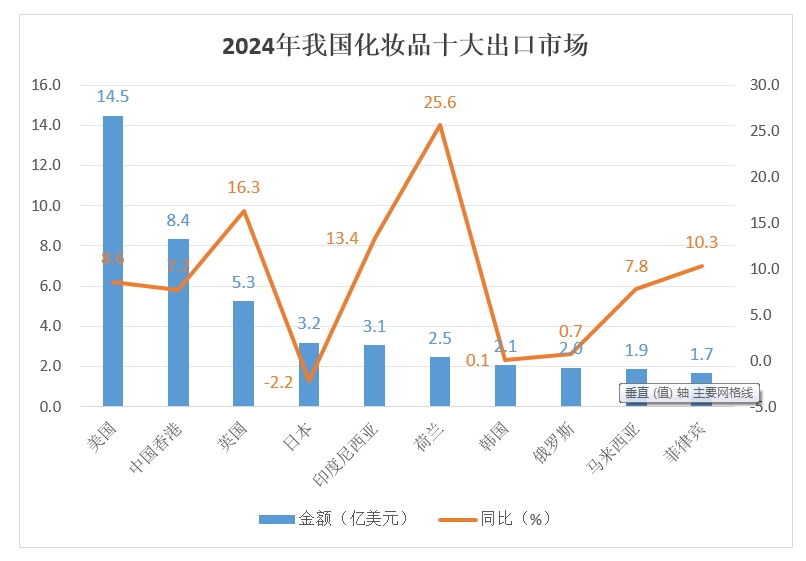 我國化妝品出口市場相對分散。2024年出口前五大市場分別是美國、中國香港、英國、日本和印度尼西亞,與2023年一致。