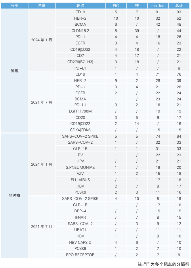 表 2021 年 7 月與 2024 年 1 月我國(guó)在研管線中腫瘤與非腫瘤治療藥物的前十大靶點(diǎn)情況