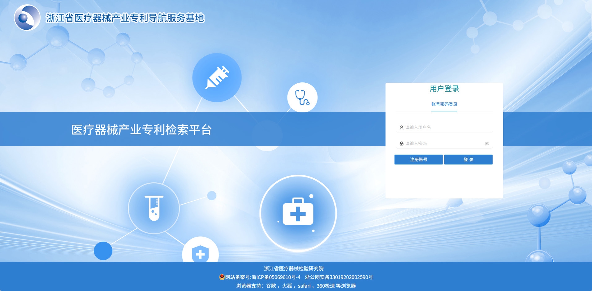 圖為醫(yī)療器械產(chǎn)業(yè)專利檢索平臺登錄頁面。 浙江省器檢院供圖