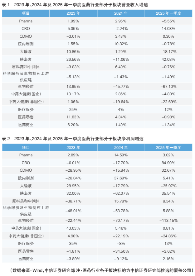 盡管2024年和2025年一季度醫(yī)藥板塊整體業(yè)績承壓,但部分子板塊成績亮眼,呈現(xiàn)出向好的潛力。(詳見表1、表2)