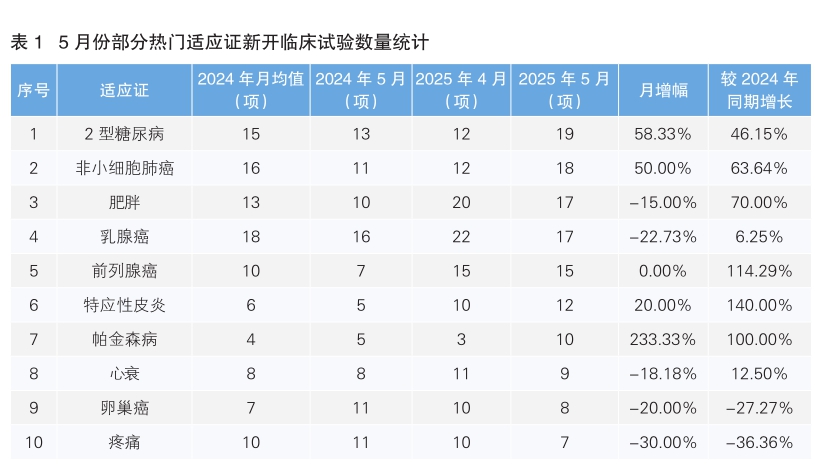 從5月份新開臨床試驗(yàn)熱門適應(yīng)證來看,2型糖尿病為最主要的熱門研發(fā)領(lǐng)域,新開試驗(yàn)19項(xiàng),相較4月份上漲58.33%,相較去年同期上漲46.15%。其次為非小細(xì)胞肺癌,新開臨床試驗(yàn)數(shù)量環(huán)比上漲50%,同比上漲63.64%。值得注意的是,5月份新開臨床試驗(yàn)數(shù)量上升幅度最大的熱門適應(yīng)證為帕金森病,由4月份的3項(xiàng)上升為10項(xiàng),上升幅度為233.33%。除此之外,相較于去年同期,新開臨床試驗(yàn)數(shù)量上漲幅度最大的適應(yīng)證為特應(yīng)性皮炎,由5項(xiàng)上升為12項(xiàng),上漲幅度為140%;數(shù)量下降幅度最大的適應(yīng)證為疼痛,由11項(xiàng)下降為7項(xiàng),下降36.36%。(詳見表1)