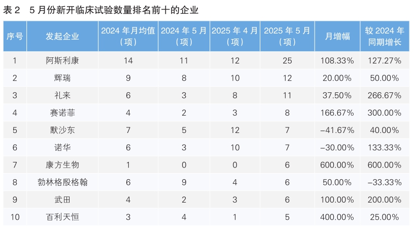 對新開臨床試驗(yàn)的發(fā)起企業(yè)進(jìn)行統(tǒng)計(jì)后發(fā)現(xiàn),5月份發(fā)起臨床試驗(yàn)最多的企業(yè)為阿斯利康,新開臨床試驗(yàn)25項(xiàng),環(huán)比上升108.33%,同比上升127.27%;其次為輝瑞,新開臨床試驗(yàn)12項(xiàng),環(huán)比上漲20%,同比增長50%。新開臨床試驗(yàn)數(shù)量上升幅度最大的企業(yè)為康方生物,與其4月份相比上升了6倍。值得注意的是,這也是我國企業(yè)康方生物首次進(jìn)入新開臨床試驗(yàn)數(shù)量排名前十榜單。(詳見表2)