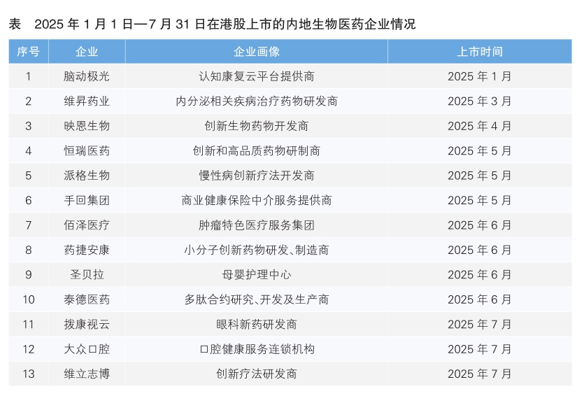 醫(yī)藥企業(yè)赴港上市熱情高漲。公開信息顯示,今年1月1日—7月31日,已有13家內(nèi)地生物醫(yī)藥企業(yè)成功登陸港股市場(詳見表),數(shù)量超過去年全年的12家。這主要得益于今年5月香港證監(jiān)會與港交所聯(lián)合發(fā)布公告,推出“科企專線”,專門助力特專科技公司及生物科技公司上市申請,并允許這些公司選擇以保密形式提交上市申請。政策激勵下,僅今年上半年,就有超過50家生物醫(yī)藥企業(yè)向港交所遞交了上市申請。