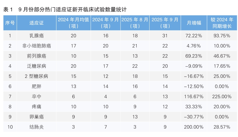 從9月份新開(kāi)臨床試驗(yàn)熱門(mén)適應(yīng)證來(lái)看,乳腺癌為最主要的熱門(mén)研發(fā)領(lǐng)域,新開(kāi)臨床試驗(yàn)31項(xiàng),環(huán)比上漲72.22%,同比上漲93.75%。其次為非小細(xì)胞肺癌,新開(kāi)臨床試驗(yàn)22項(xiàng),與去年同期相比上漲10.00%。值得注意的是,9月份新開(kāi)臨床試驗(yàn)數(shù)量上升幅度最大的熱門(mén)適應(yīng)證為結(jié)腸炎,由8月份的3項(xiàng)上升至9項(xiàng),上升幅度為200.00%;數(shù)量下降幅度最大的適應(yīng)證為卵巢癌,由8月份的13項(xiàng)下降到9項(xiàng),下降幅度為30.77%。(詳見(jiàn)表1)