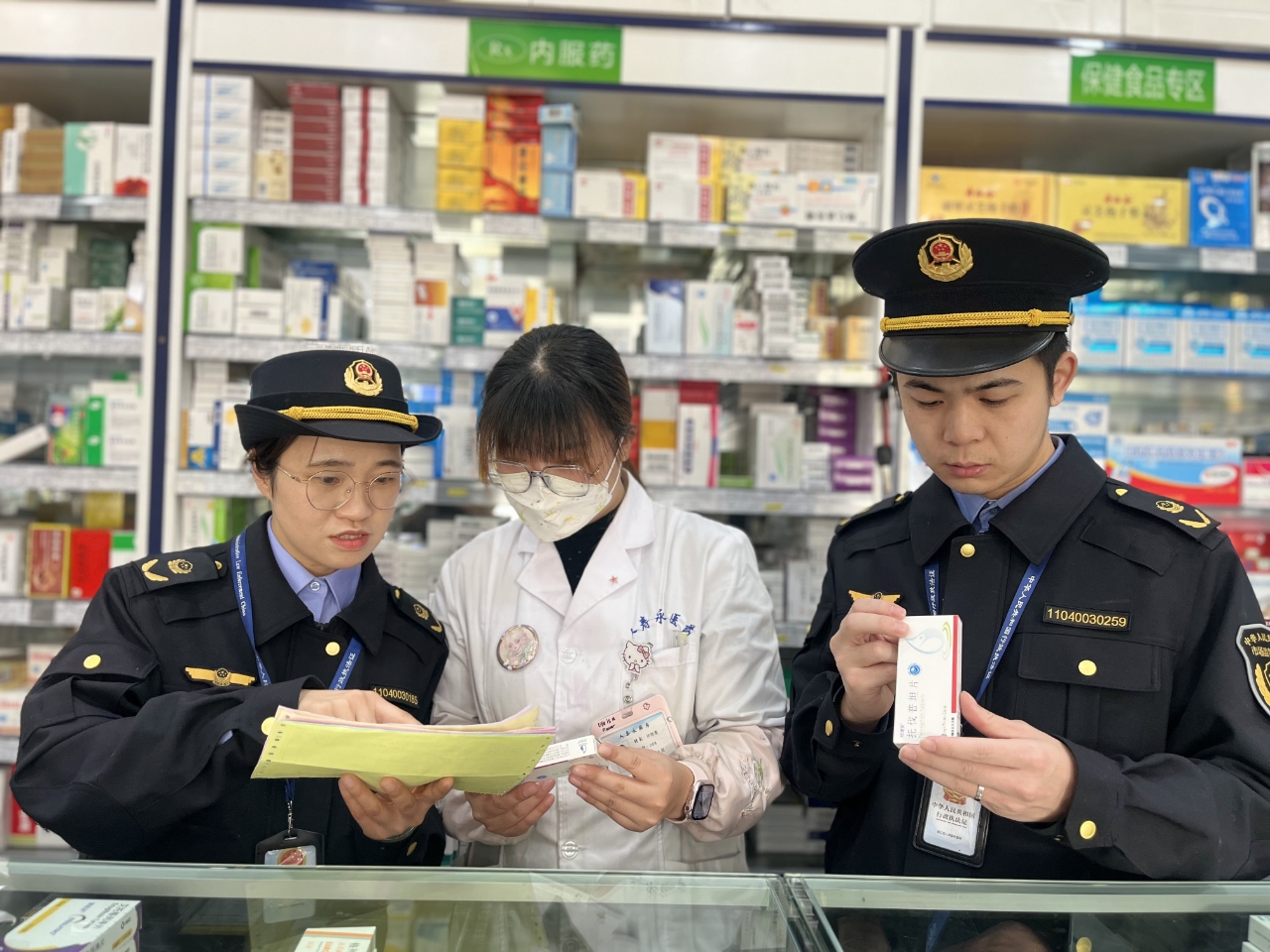 該局執(zhí)法人員正在一家藥店內(nèi)檢查其經(jīng)銷的相關(guān)藥品購(gòu)進(jìn)渠道是否合法、票賬貨款是否一致。