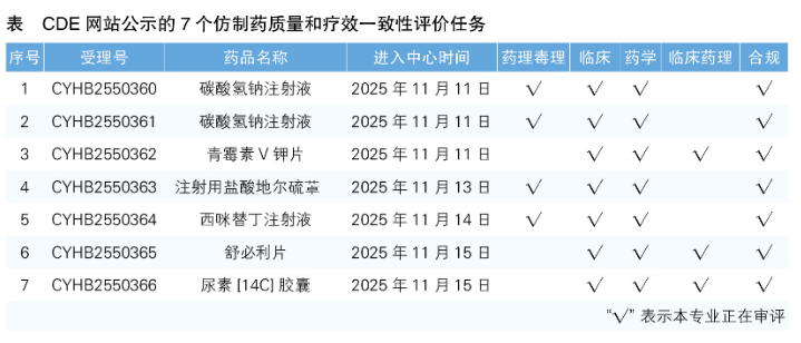 6.CDE網(wǎng)站公示7個仿制藥質(zhì)量和療效一致性評價任務(wù)(詳見表),涉及碳酸氫鈉注射液等品種。