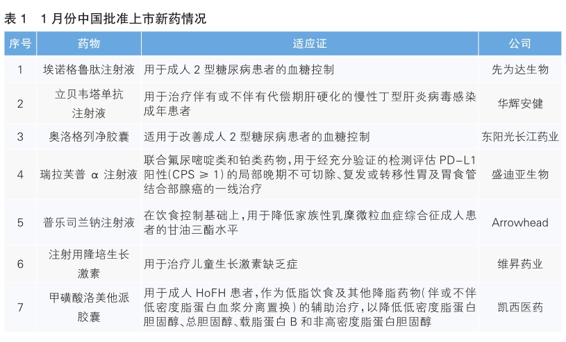 1月份,我國共批準(zhǔn)7款新藥上市(詳見表1)。根據(jù)Pharmadigger數(shù)據(jù)庫,其中埃諾格魯肽注射液、立貝韋塔單抗注射液、奧洛格列凈膠囊和瑞拉芙普α注射液為我國企業(yè)自主研發(fā)的全球范圍內(nèi)首次獲批上市的新藥。