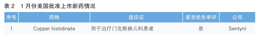 1月份,美國批準(zhǔn)上市1款新藥。根據(jù)Pharmadigger數(shù)據(jù)庫,該藥為全球范圍內(nèi)首次獲批(詳見表2)。