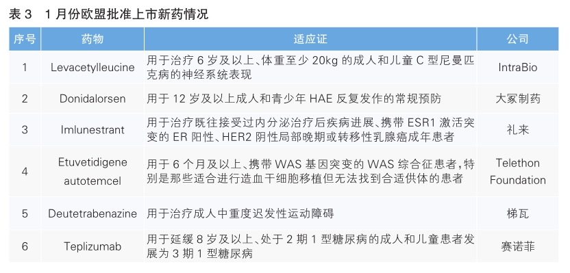 1月份,歐盟共批準(zhǔn)6款新藥上市。根據(jù)Pharmadigger數(shù)據(jù)庫,均非全球首次批準(zhǔn)的新藥(詳見表3)。
