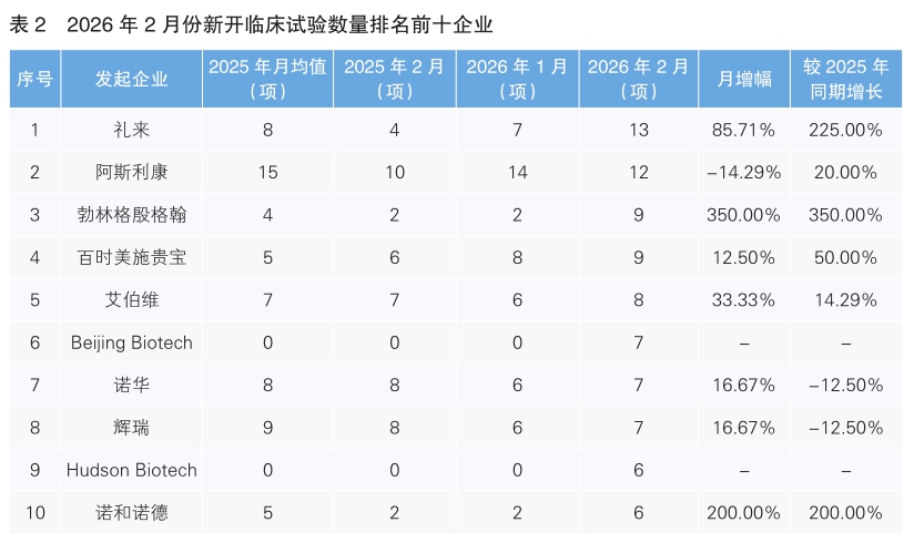 對(duì)新開臨床試驗(yàn)的發(fā)起單位進(jìn)行統(tǒng)計(jì)后發(fā)現(xiàn),2月份發(fā)起臨床試驗(yàn)最多的企業(yè)是禮來,新開臨床試驗(yàn)13項(xiàng),環(huán)比上升85.71%,同比上漲225%。其次為阿斯利康,新開臨床試驗(yàn)12項(xiàng),環(huán)比下降14.29%,同比增長20%。新開臨床試驗(yàn)數(shù)量上升幅度最大的企業(yè)為勃林格殷格翰,新開臨床試驗(yàn)9項(xiàng),環(huán)比同比均增長350%。(詳見表2)