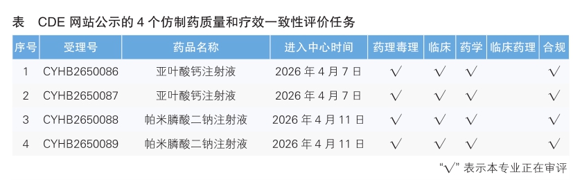 7.CDE網(wǎng)站公示4個(gè)仿制藥質(zhì)量和療效一致性評(píng)價(jià)任務(wù)(詳見表),涉及亞葉酸鈣注射液等品種。