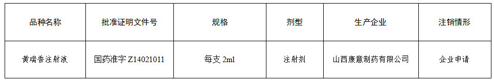 根據(jù)《中華人民共和國藥品管理法實施條例》和《藥品注冊管理辦法》的有關(guān)規(guī)定,國家藥品監(jiān)督管理局決定注銷黃瑞香注射液(國藥準字Z14021011)藥品批準證明文件。