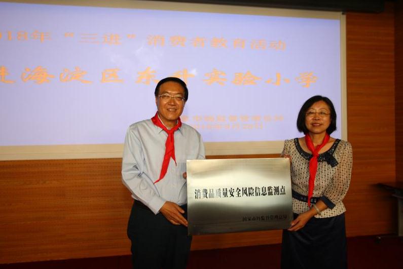 圖為陳鋼向海淀區(qū)東升實(shí)驗(yàn)小學(xué)頒授“消費(fèi)品質(zhì)量安全風(fēng)險(xiǎn)信息監(jiān)測(cè)點(diǎn)”牌匾