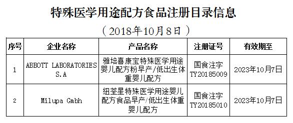 2018年10月8日,國家市場監(jiān)督管理總局批準(zhǔn)2家企業(yè)共2個特殊醫(yī)學(xué)用途配方食品注冊。