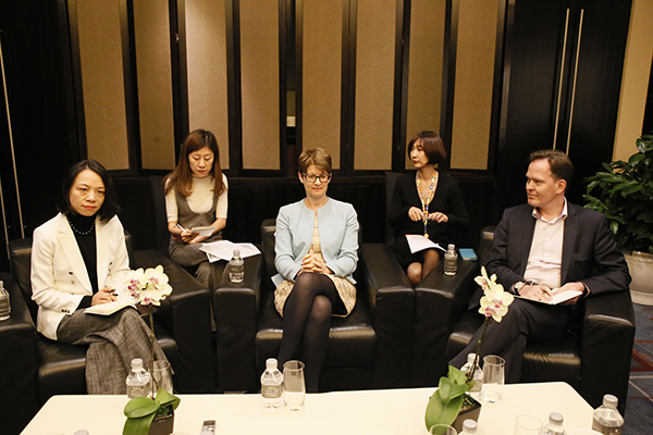 圖為GSK中國特藥業(yè)務(wù)部副總裁陳思淵(前排左一)、GSK控股ViiV Healthcare 公司首席執(zhí)行官Deborah Waterhouse(前排左二)、GSK中國處方藥及疫苗部總經(jīng)理魏廉昇(前排左三)接受媒體采訪。
