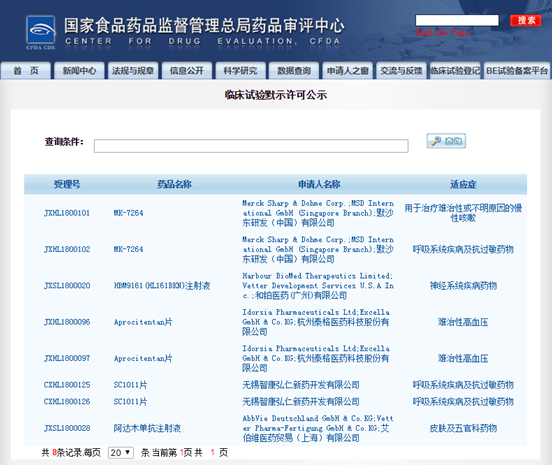 進入欄目可以看到,已有8個受理號獲得默許,其中不僅包括來自默沙東研發(fā)(中國)有限公司和艾伯維醫(yī)藥貿易(上海)有限公司等跨國制藥企業(yè)的注冊申請,也有來自和鉑醫(yī)藥(廣州)有限公司、無錫智康弘仁新藥開發(fā)有限公司等國內制藥企業(yè)的申請。