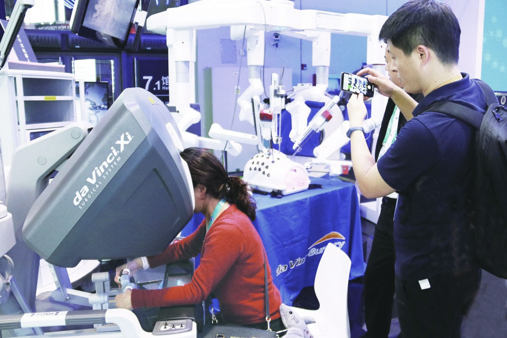 首屆中國國際進口博覽會觀眾在排隊“操作”新一代“達芬奇手術(shù)機器人”