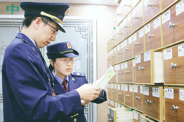 浙江省象山縣市場(chǎng)監(jiān)管局執(zhí)法人員在一家藥店查看中藥飲片性狀