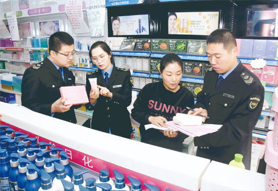 圖為12月10日該局執(zhí)法人員在一家化妝品銷售門店開展檢查。 李慧 攝