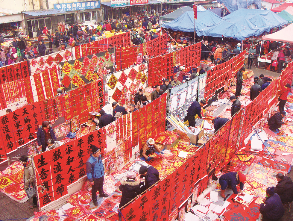 老青島人常說,在李村大集“沒有買不到的,只有找不到的”。大集上的交易品種形形色色,柴米油鹽醬醋茶,一應俱全;冰糖葫蘆、老旱煙、被罩床單、鍋碗瓢盆等,隨處可見。一年之中最熱鬧和喜慶的要屬臘月集。臘月集上除日常消費品,如新衣、新帽、布匹、百貨、食品等種類和數(shù)量都大大增加之外,還有琳瑯滿目的應節(jié)年貨,煙花爆竹、年畫春聯(lián)、窗花門神、燈籠蠟燭……李村大集變成一片火紅的海洋。