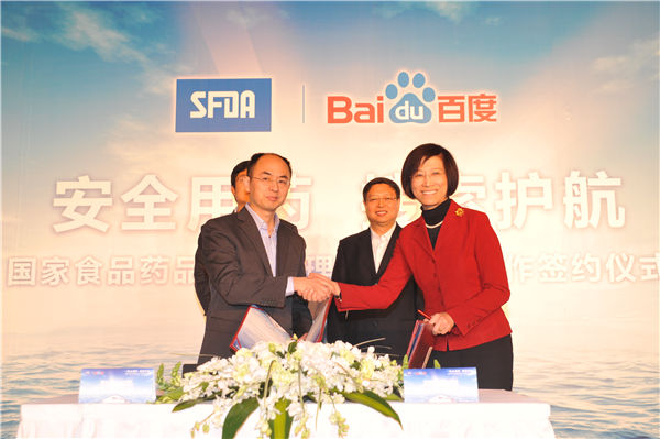 2013年2月25日,國家食品藥品監(jiān)督管理局與百度簽約開展“安全用藥,搜索護航”戰(zhàn)略合作 鄧橋攝