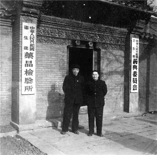 1950年8月,中央人民政府衛(wèi)生部藥物食品檢驗(yàn)所成立,黃化門原址前合影(左為袁士誠(chéng)先生,右為涂國(guó)士先生) 中檢院提供