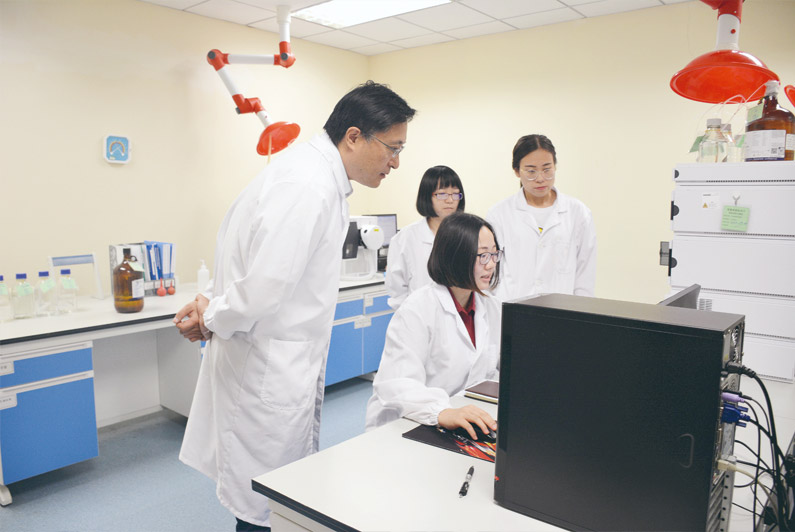 圖②前沿生物藥業(yè)董事長(zhǎng)謝東(左一)與科研人員在實(shí)驗(yàn)室進(jìn)行抗艾滋病新藥質(zhì)量控制研究。