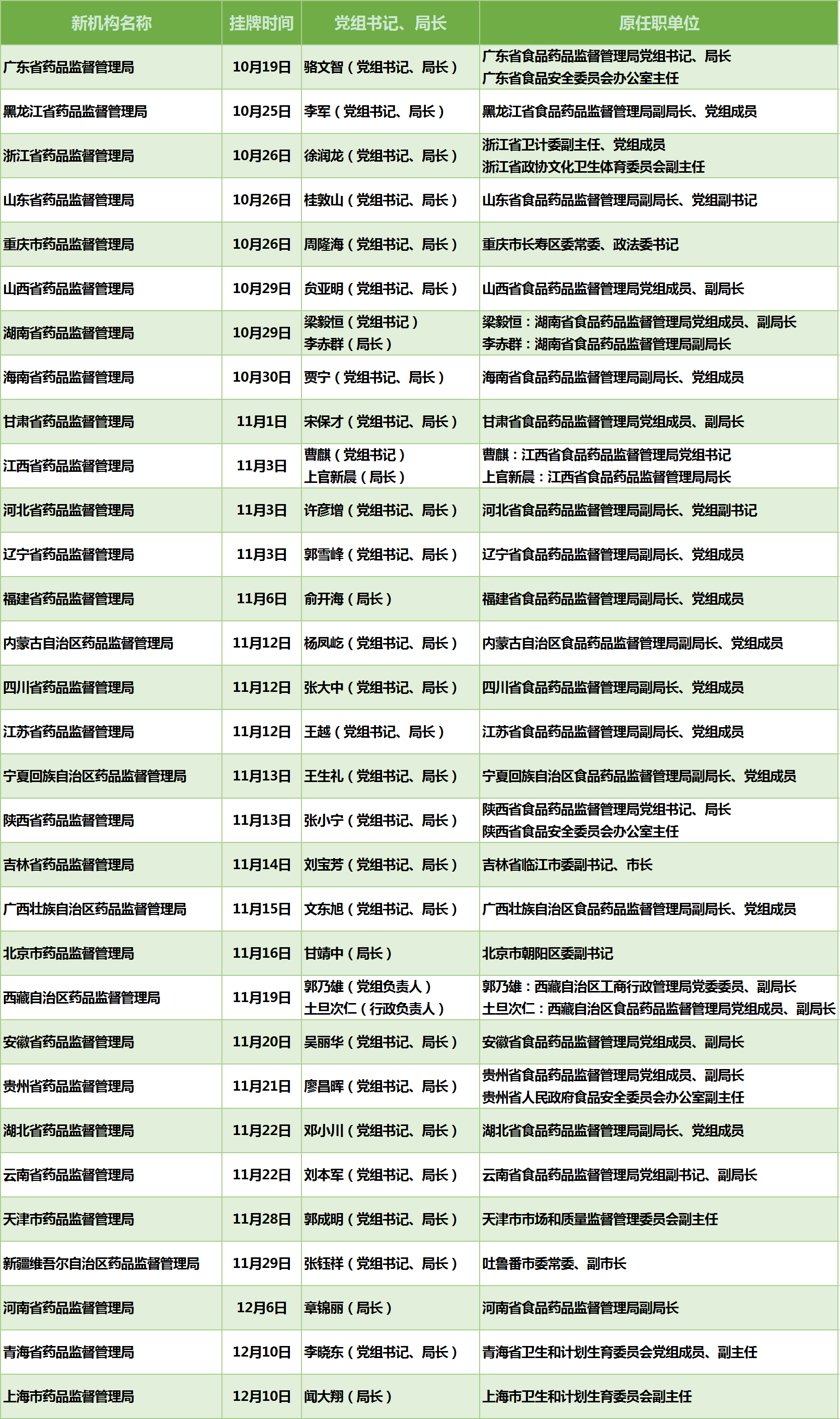 根據(jù)各省機(jī)構(gòu)改革具體實(shí)施方案和時(shí)間表,10月19日廣東省藥品監(jiān)管局掛牌成立,12月10日青海省藥品監(jiān)督管理局掛牌履職。至此,全國(guó)31個(gè)省級(jí)藥品監(jiān)督管理局均已正式掛牌成立,新領(lǐng)導(dǎo)班子陸續(xù)履新。據(jù)統(tǒng)計(jì),大部分省份的黨組書(shū)記、局長(zhǎng)來(lái)自原食品藥品監(jiān)督管理局。