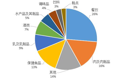 從食品輿情事件涉及的品類來看,如圖7所示,餐飲依然是問題比較集中的行業(yè),占比超過26%,其次肉及肉制品占比16%、保健食品占比達到13%,乳及乳制品占比9%、酒類占比7%。