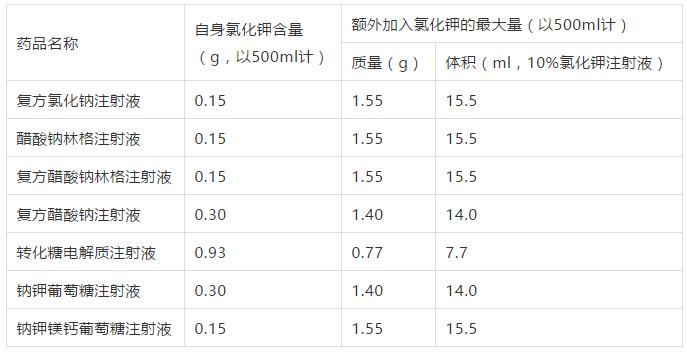 表2 臨床常見電解質(zhì)類注射液及氯化鉀注射液額外可加入劑量