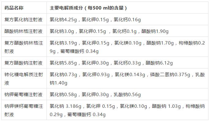 臨床常見的電解質(zhì)類注射液及其成分見下表。