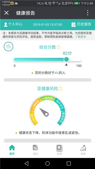 檢測結果出來后,記者嚇了一跳:健康報告顯示"您的綜合分數(shù)為82分,好于4%的人,處于二級亞健康風險。健康狀態(tài)下降、機體功能中度紊亂或緊張,情緒偶有悲觀厭世,睡眠質量有待改善"。在"實時狀態(tài)"一欄中顯示,反應力接近為零,腦力、缺水、缺氧等指標也剛剛高于滿分的一半,同時存在免疫蛋白球輕微異常、胃蠕動和胃吸收能力偏弱、脂代謝偏弱、前列腺增生等問題。這跟自己兩個月前的體檢結果——身體各項指標均正常有很大差異。難道短短兩個月的時間,身體狀況就"垮掉"了?記者不禁驚出了一身冷汗。