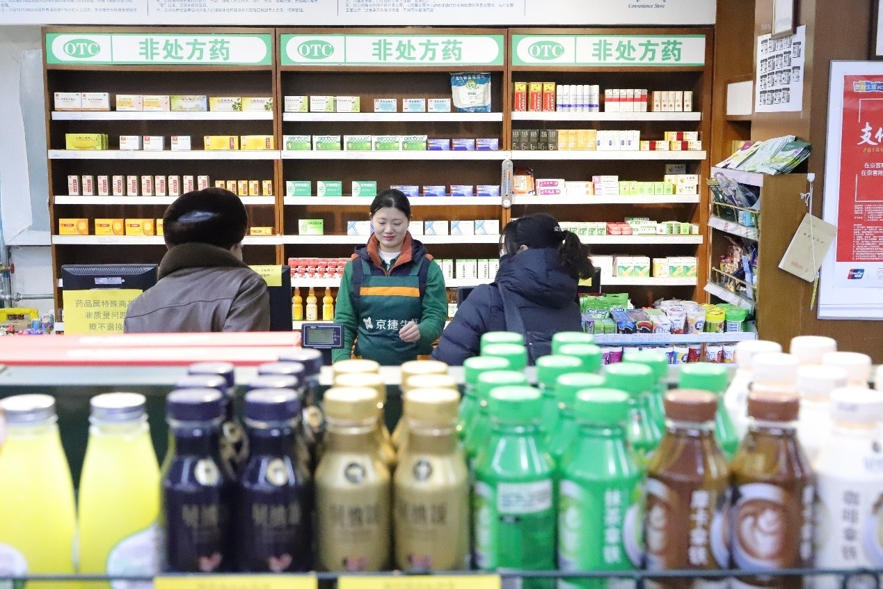 2018年12月13日,記者第一次走進(jìn)這家位于工體東路13號(hào)樓的門店,門前醒目的京捷生鮮綠色招牌、店內(nèi)擺放整齊的貨架及食品、生意紅火的小吃窗口都在提醒人們,這里與一家普通便利店并無二致。但記者很快發(fā)現(xiàn)了“玄機(jī)”——入口處收銀臺(tái)后的貨架上,綠色OTC(非處方藥)的標(biāo)牌醒目,下面整齊碼放著各種OTC類藥品,收銀臺(tái)對(duì)面則是“醫(yī)療器械”和“保健食品專柜”貨架。