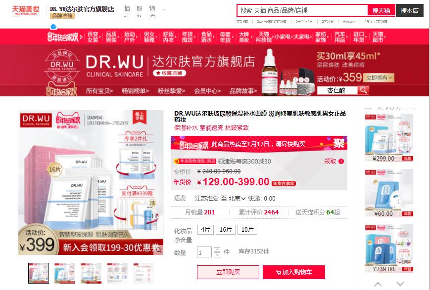 DR.WU達(dá)爾膚官方旗艦店在其產(chǎn)品玻尿酸保濕補(bǔ)水面膜的頁面宣稱該產(chǎn)品"滋潤修復(fù)肌膚 敏感肌男女正品藥妝"(1月16日晚)