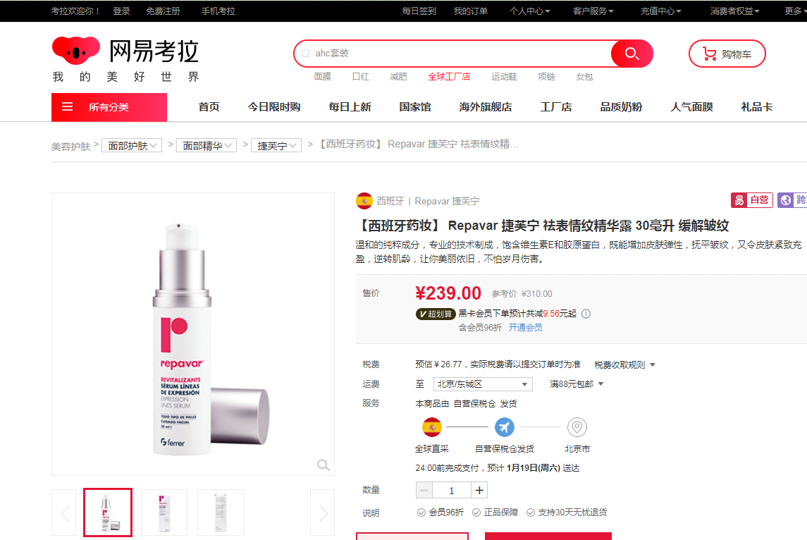 記者在網(wǎng)易考拉的平臺(tái)上,搜索"藥妝"也有不少西班牙、意大利和澳洲品牌的產(chǎn)品在簡介中使用"藥妝"一詞。如Repavar捷芙寧特意標(biāo)注了 "西班牙藥妝"。