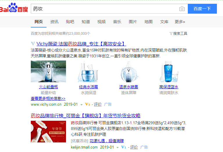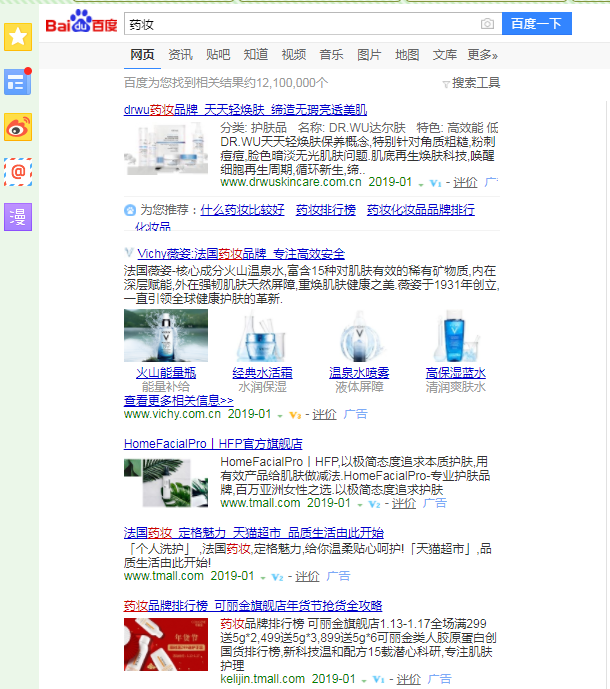 1月16日晚,記者在百度搜索"藥妝",出現(xiàn)的第一條鏈接為"Vichy薇姿:法國藥妝品牌 專注高效安全"