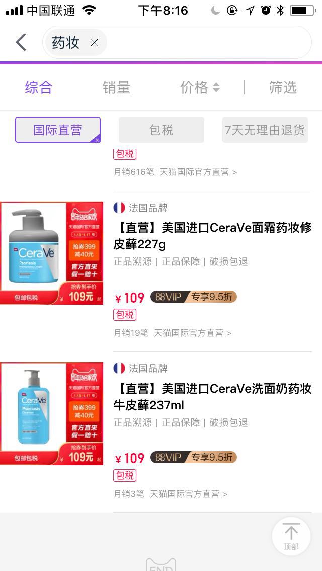 天貓國際官方直營出售的美國品牌CeraVe的面霜與洗面奶,產(chǎn)品名稱后面宣稱"藥妝修復(fù)牛皮癬"(1月16日晚)