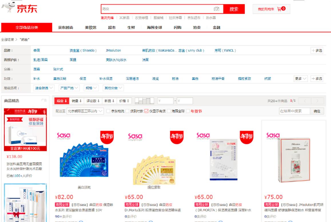 1月20日16時(shí)記者在京東平臺(tái)搜索"藥妝"關(guān)鍵詞的部分截圖