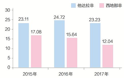 圖2 2015~2017年他達(dá)拉非與西地那非全球銷售數(shù)據(jù)(億美元)