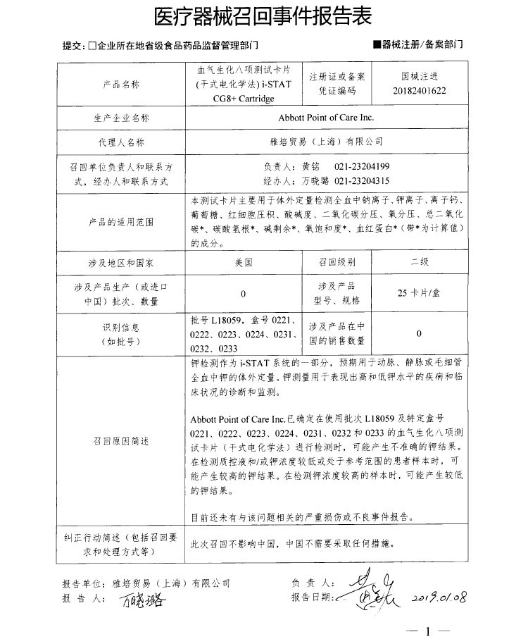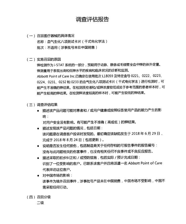 雅培貿(mào)易(上海)有限公司報(bào)告,由于涉及產(chǎn)品可能存在鉀離子的檢測(cè)結(jié)果不準(zhǔn)確的問(wèn)題,生產(chǎn)商Abbott Point of Care Inc.對(duì)血?dú)馍隧?xiàng)測(cè)試卡片(干式電化學(xué)法)i-STAT CG8+ Cartridge(注冊(cè)證編號(hào):國(guó)械注進(jìn)20182401622)主動(dòng)召回。召回級(jí)別為二級(jí)。涉及產(chǎn)品的型號(hào)、規(guī)格及批次等詳細(xì)信息見(jiàn)《醫(yī)療器械召回事件報(bào)告表》。